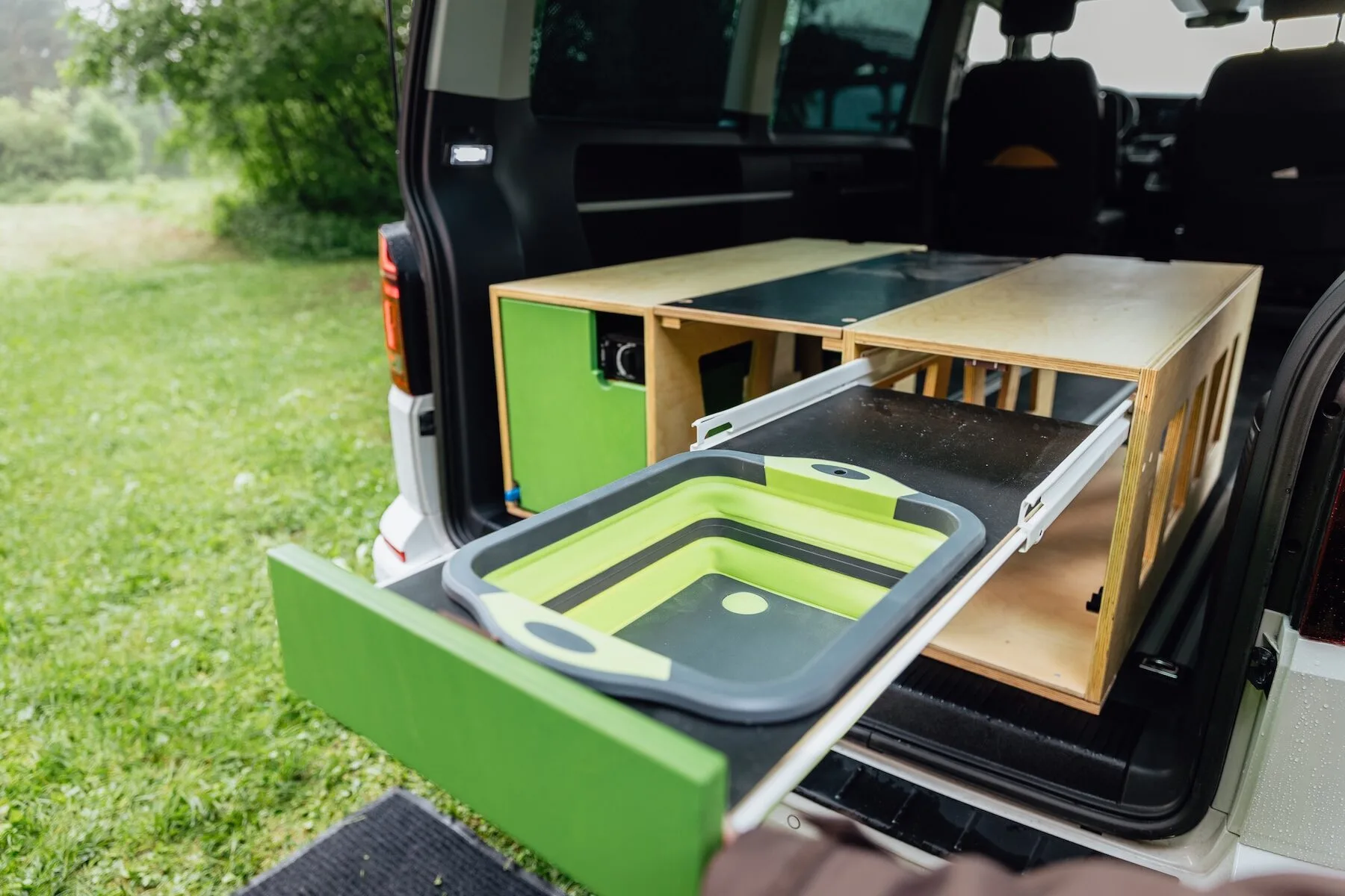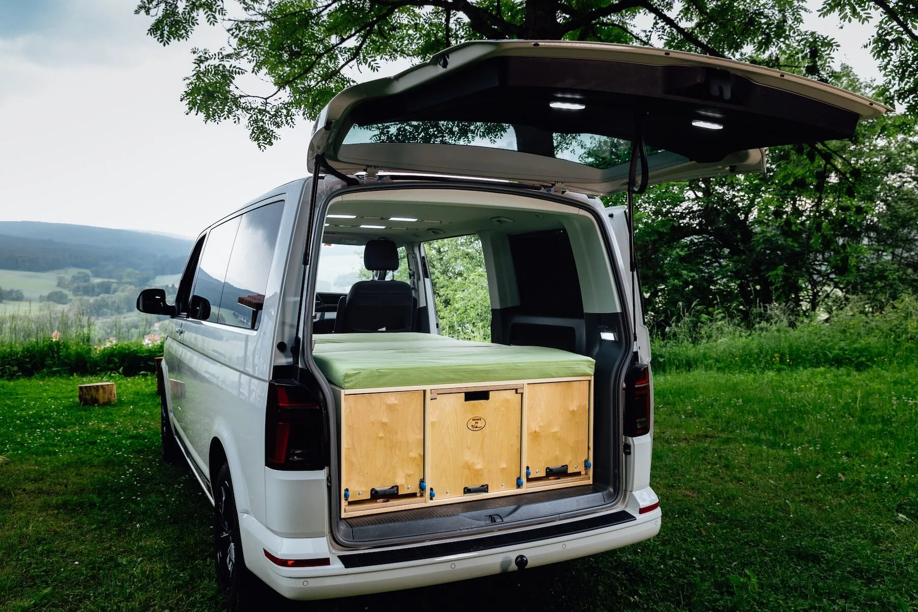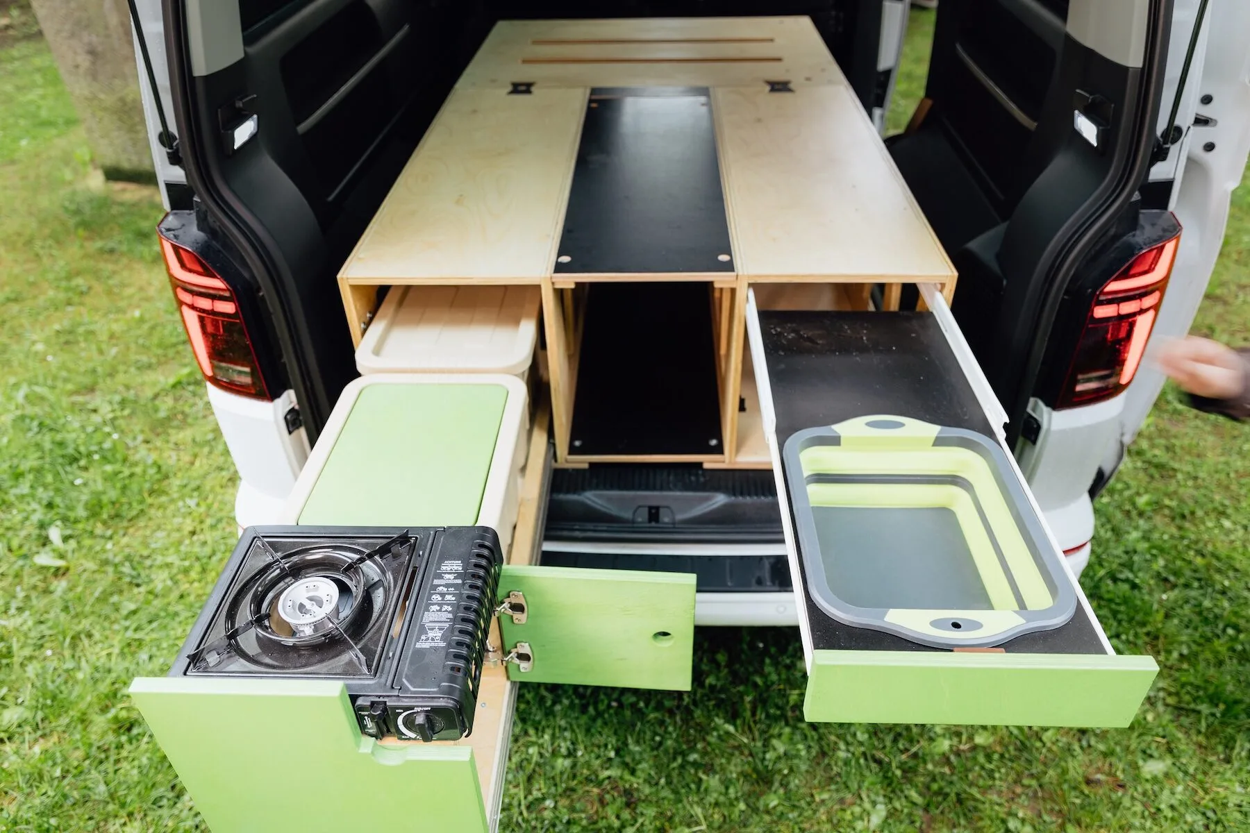 Die Rhöner Van.Camp.Box ist ein durchdachtes Campingmodul für Hochdachkombis, Transporter und Vans. ✔️ Vollauszug-Schublade ✔️ Viel Stauraum ✔️ Liegefläche auf 3-teiliger Matratze ✔️ Modularer Aufbau ✔️ Matratze & Gaskocher inklusive